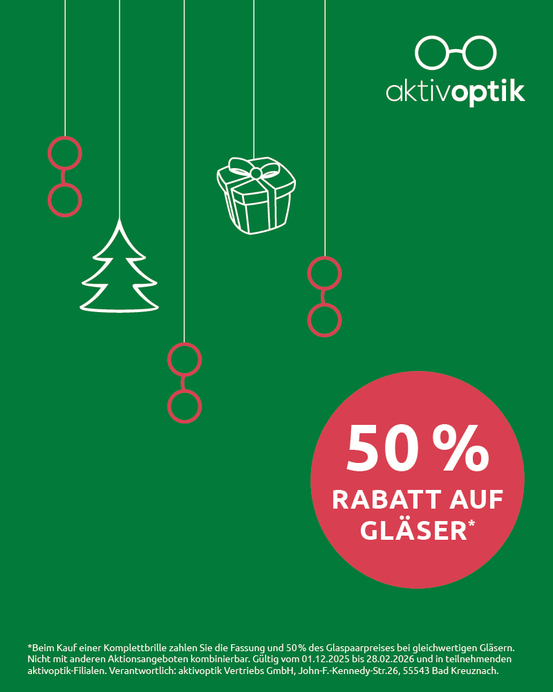 Greifen Sie zu: Beim Kauf einer Komplettbrille zahlen Sie die Fassung und 50% des Glaspaarpreises bei gleichwertigen Gläsern.